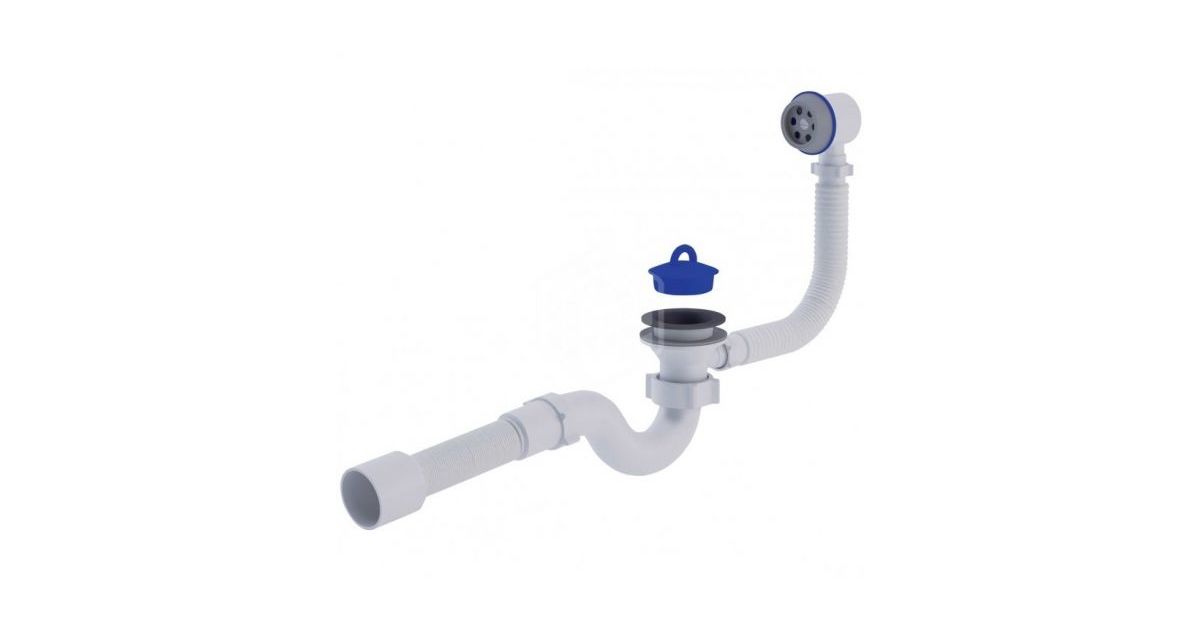 Сифон АНИ для ванны 1.1/2"*40 с выпуском и переливом прямоточный, с системой "клик-клак". С гибкой трубой 40*50 EC155. Слив воды закрывается и открывается путем нажатия на кнопку выпуска, выход для подключения к канализации 40 мм.