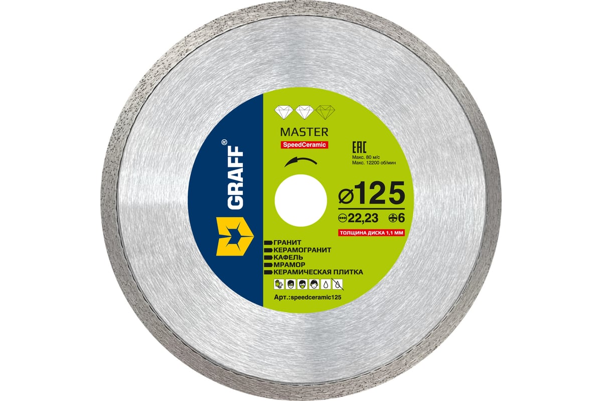 Алмазный диск по керамической плитке диаметром 125 мм GRAFF для болгарки (УШМ). Диск изготовлен методом термической опрессовки и предназначен для резки настенной и напольной керамической плитки, искусственного камня, тротуарной плитки.