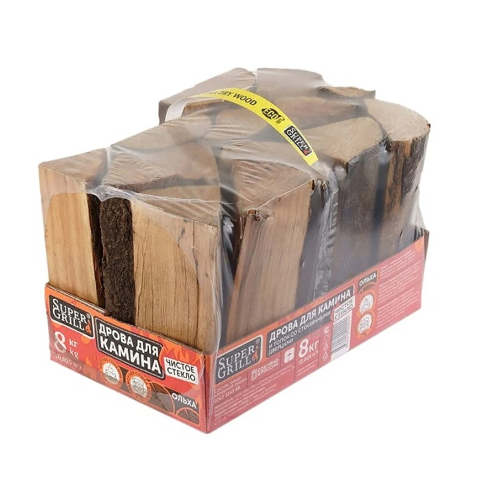 Дрова Supergrill из ольхи для камина — экстра сухие, с чистым стеклом. Колотые, камерной сушки, в упаковке 8 кг. Они идеально подходят для каминов и печей с стеклянной дверцей.