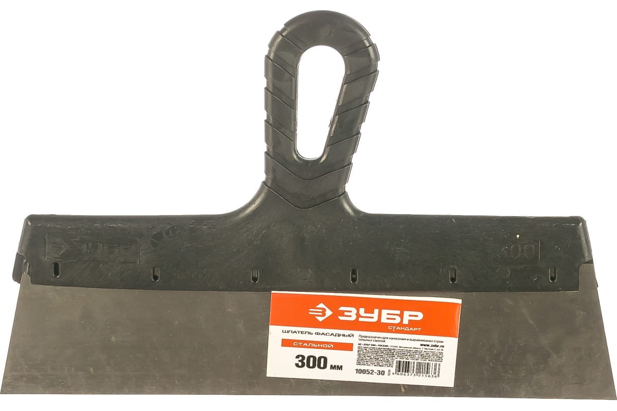 Фасадный шпатель 300 мм Зубр СТАНДАРТ 10052-30 служит для нанесения и разравнивания строительных смесей на поверхностях с большой площадью. Данный инструмент используется во время проведения отделочных работ. Он обладает прочным стальным полотном и пластиковой рукояткой, обеспечивающей комфорт при эксплуатации.