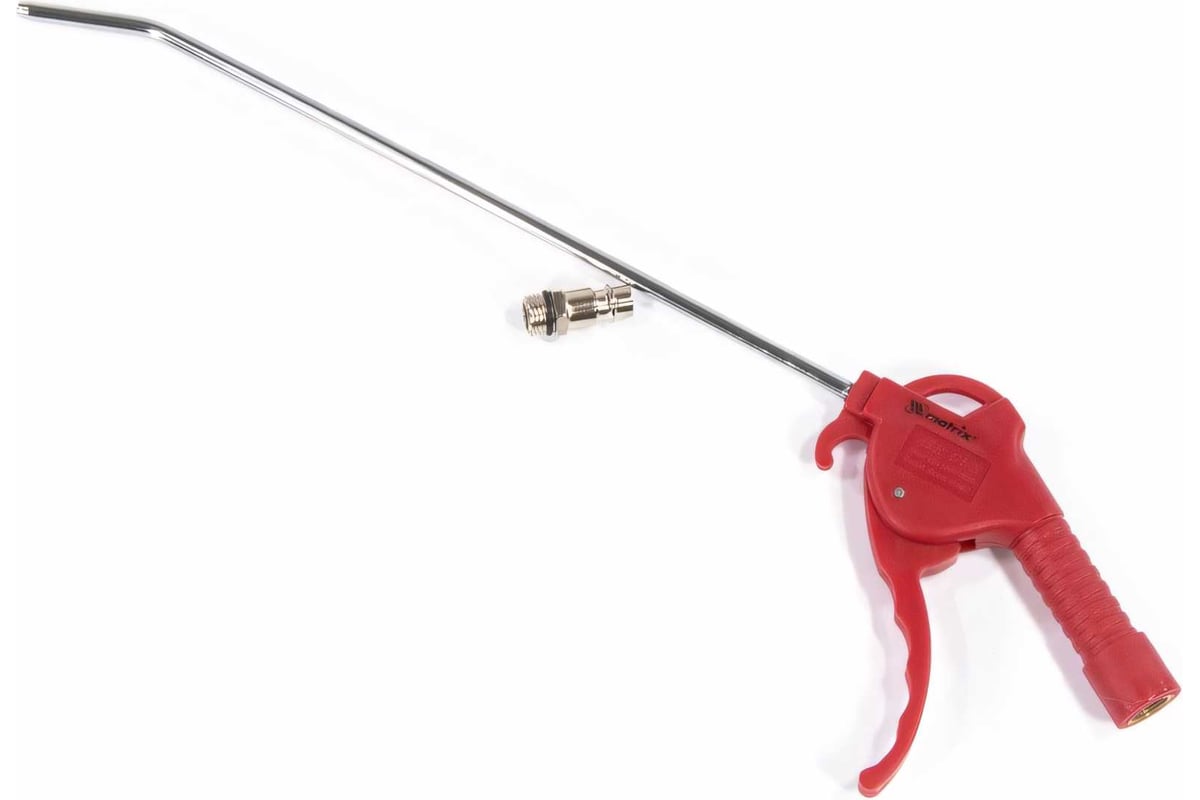 Пневматический продувочный пистолет с удлиненным изогнутым соплом MATRIX 270 мм 57334 используется для продувки малых отверстий и больших поверхностей.