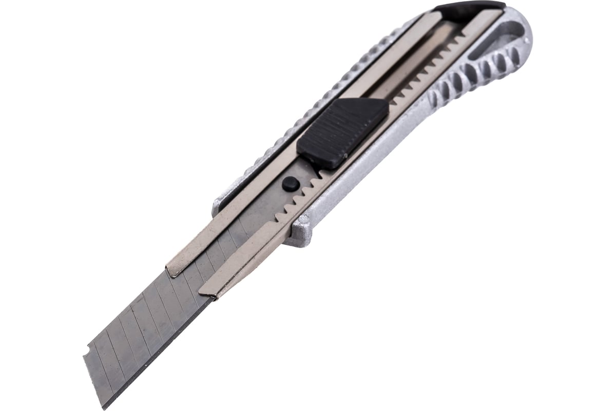 Нож с выдвижным лезвием 18 мм, металлический корпус, металлическая направляющая, автоматический фиксатор, Вихрь предназначен для резки различных материалов в бытовых, хозяйственных или строительных целях. Нож имеет выдвижные, сегментированные, сменные лезвия, которые можно отламывать по мере износа режущей части.