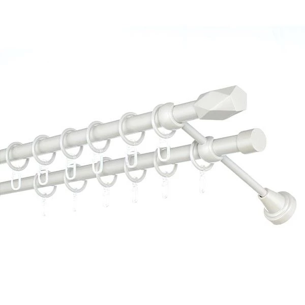 Этот изысканный карниз сочетает в себе геометрическую эстетику и благородство жемчужного оттенка, создавая атмосферу утонченного уюта. Двухрядная конструкция с диаметром 19 мм позволяет использовать как легкие занавески, так и плотные шторы, идеально подходя для окон среднего размера.
