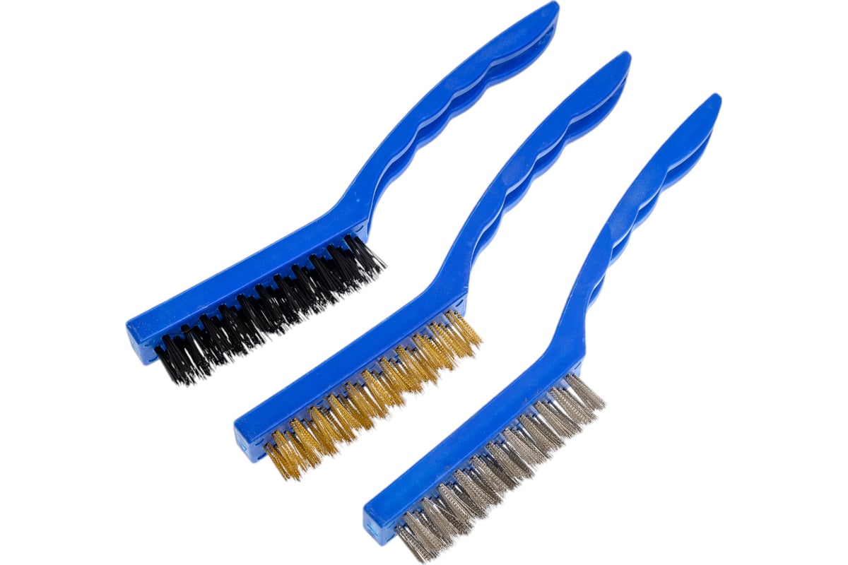 Набор больших щеток применяется для очистки деревянных, металлических и других поверхностей от старых лакокрасочных покрытий, ржавчины и иных загрязнений. Стальная проволока повышенной жесткости надежно закреплена в пластиковом основании. Щетки подходят для профессионального и бытового использования.