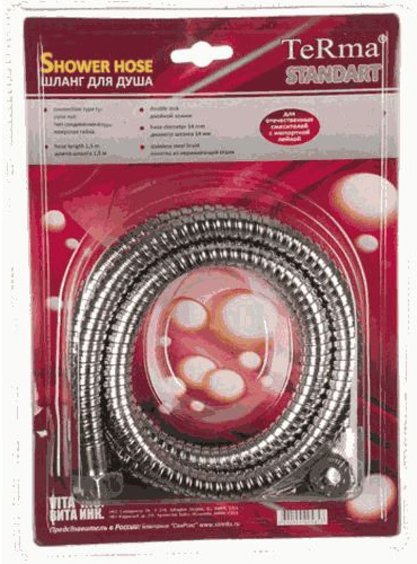 Шланг для душа М22-1/2 конус нерж д14мм*175см двойной зажим блистер TERMA из нержавеющей стали диаметр 14 мм*длина 175 см двойной зажим STANDART, блистер шланг для душа TERMA Standart применяется для подачи воды от смесителя до лейки, что, в свою очередь, позволяет потребителю получить необходимый поток воды для своих нужд. Состоит из ПВХ шланга в оплетке из нержавеющей стали двойного зажима, длина 1,75 метра, диаметр 14 мм. Присоединение к смесителю происходит с помощью накидной гайки M22, присоединение к лейке происходит с помощью конусной накидной гайки 1/2" (16 мм). шланг подходит к отечественным смесителям и импортным лейкам.
