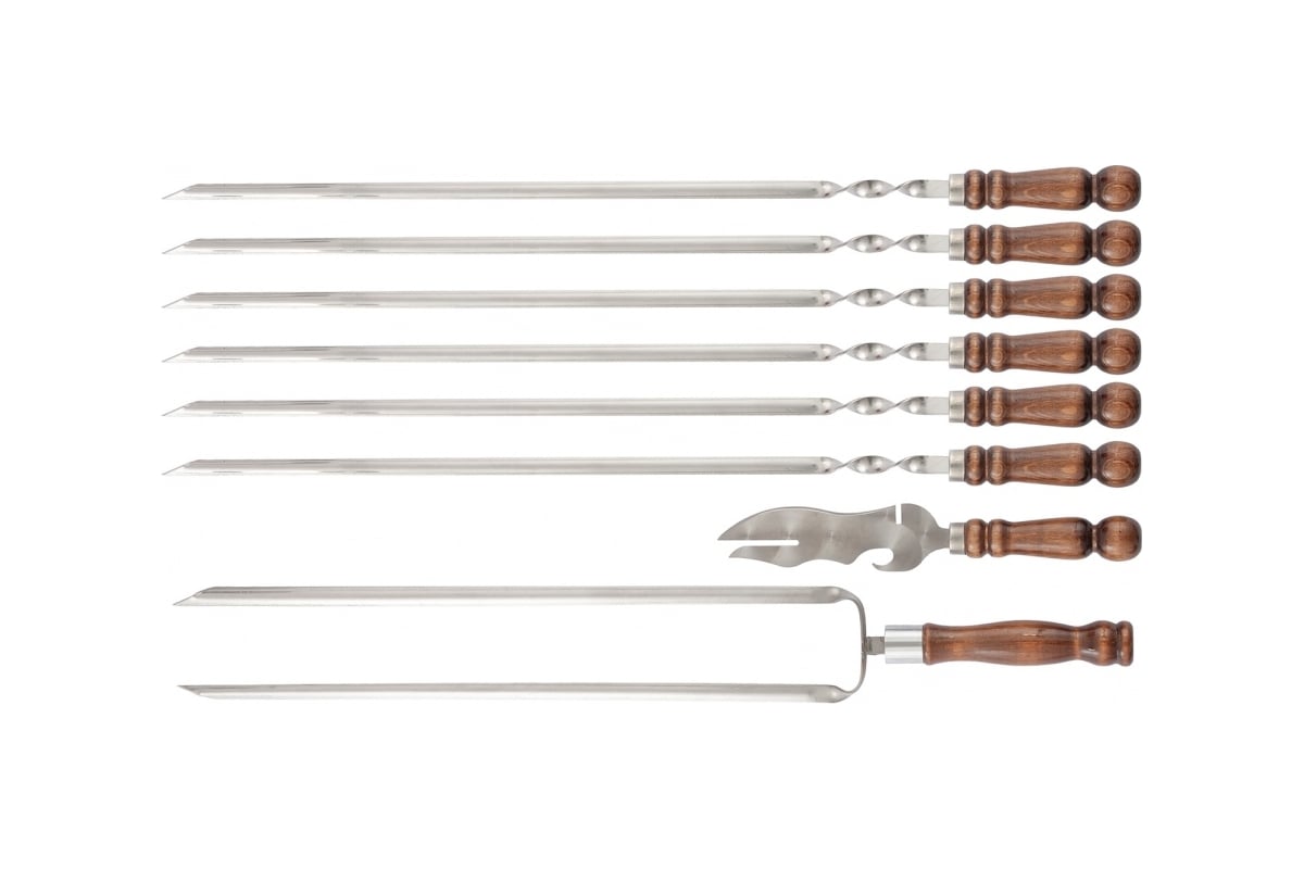Увеличенная толщина шампура не позволяет сгибаться и деформироваться под тяжестью нанизанных продуктов.