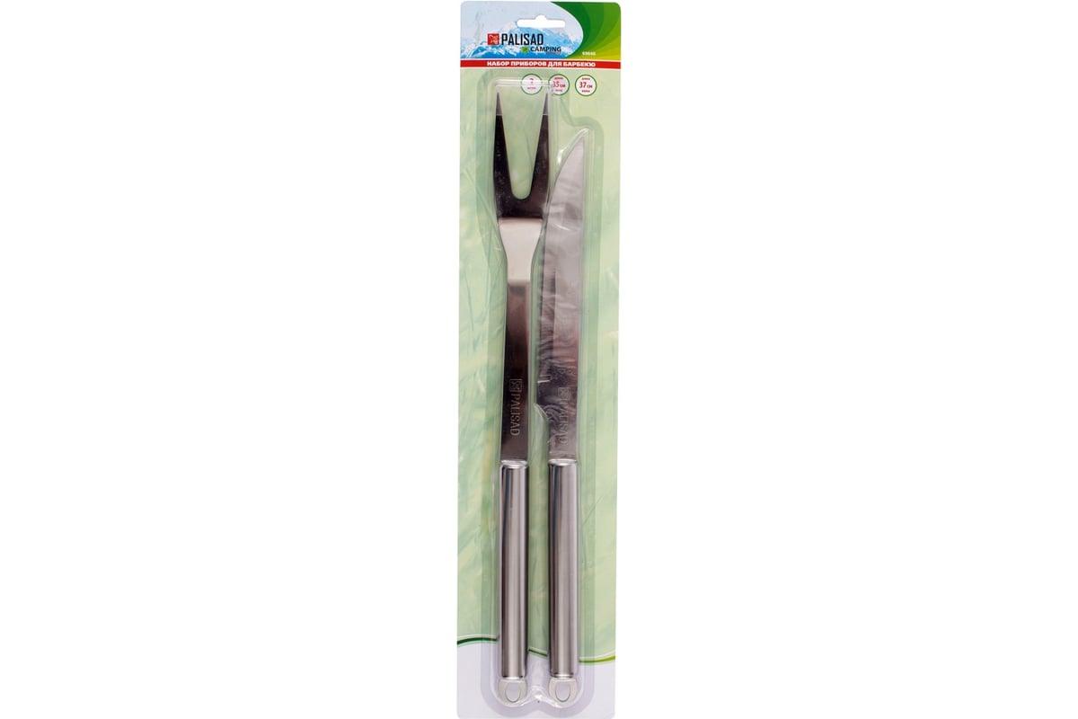 Набор приборов для барбекю Palisad Camping 69646 включает 2 предмета в блистере и обеспечивает комфортное приготовление пищи в мангале и на гриле. С помощью вилки можно захватывать и переворачивать мясо, овощи и рыбу, а универсальный нож используется для нарезания продуктов.