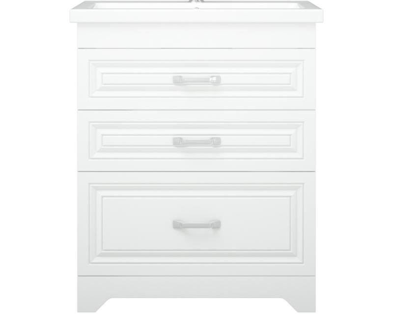 Тумба "Каролина 70" оснащена тремя выдвижными ящиками на направляющих скрытого монтажа. Верхний ящик высотой 80 мм с выпилом под коммуникации, средний - 80 мм, нижний - 130 мм. Коромысло, фасады, цоколь - МДФ в плёнке ПВХ.