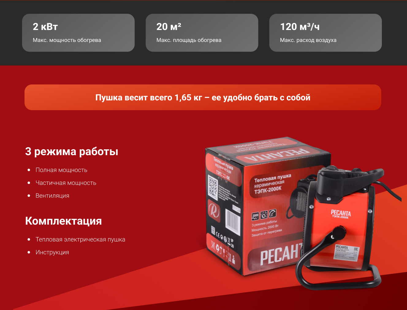 Компактная, удобная, экологичная, функциональная модель Ресанта ТЭПК-2000К пригодится на даче, в городской квартире, строительном вагончике, бытовке, вахтерке и других местах, где постоянно находятся люди.