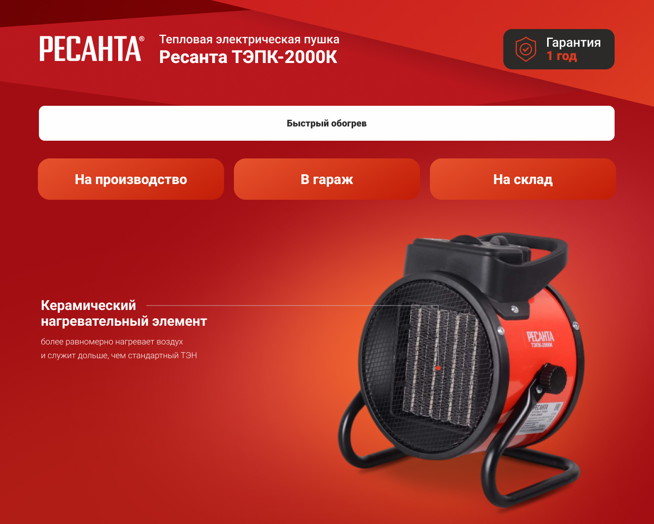 Электрическая тепловая пушка Ресанта ТЭПК-2000К с максимальной мощностью 2000 Вт, термозащитой, терморегулятором и керамическим нагревательным элементом станет отличным выбором для быстрого и безопасного обогрева жилых помещений, складов и других объектов.