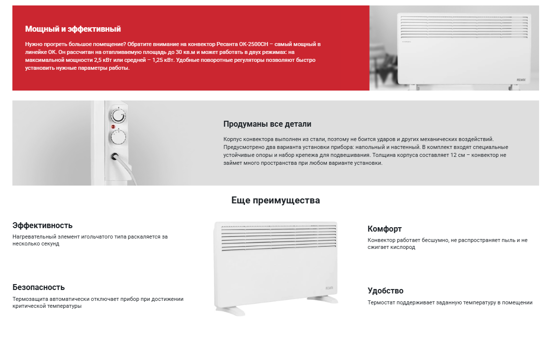 Самая мощная модель электроконвектора Ресанта ОК-2500СН в линейке «ОК» предназначена для обогрева помещений площадью до 30 м². Она оснащена терморегулятором и может работать на двух мощностях: 1.25 и 2.5 кВт. Особенностью этого конвектора является наличие в конструкции так называемого Стича – игольчатого нагревательного элемента, который обладает рядом преимуществ перед ТЭНами и другими видами нагревателей. Он способен практически мгновенно выходить на заданный температурный режим, работает бесшумно, не сжигает кислород в помещении и немного весит, облегчая вес всей конструкции конвектора.