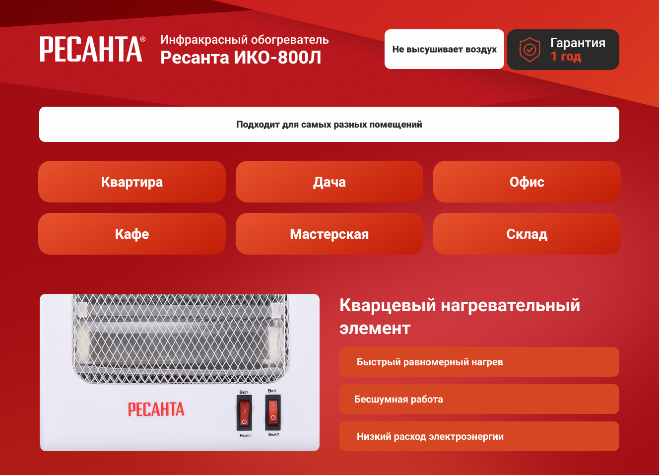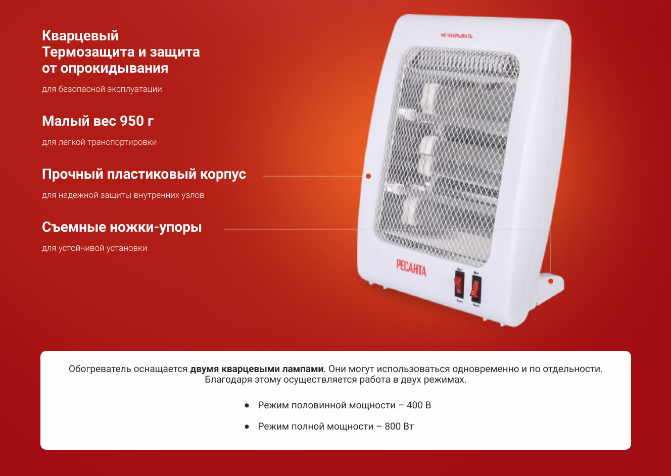 Достоинства инфракрасного лампового (кварцевого) обогревателя Ресанта ИКО-800Л: