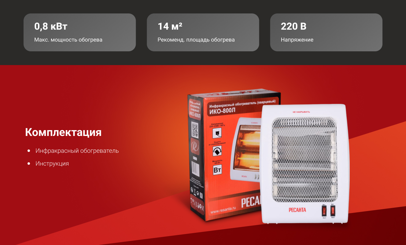 Инфракрасный ламповый (кварцевый) обогреватель Ресанта ИКО-800Л – компактная переносная модель мощностью 800 Вт для зонального или дополнительного обогрева промышленных и бытовых помещений. При отсутствии центрального отопления является оптимальным вариантом для небольших комнат площадью до 14 м².