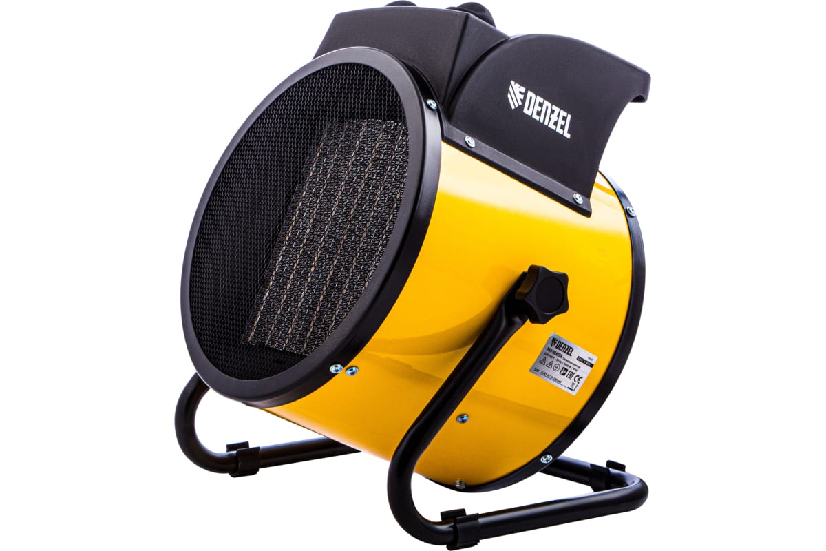 Тепловая пушка (тепловентилятор) Denzel DHC 5-400 96428 с керамическим нагревателем работает от сети 230 В, потребляет мощность 0,04, 3 или 5 кВт и пригодится в любую погоду: в холод она обогреет помещение, а в жару ее можно использовать как вентилятор. Также пушка применяется во время отделочных работ для просушки поверхностей — окрашенных и оштукатуренных стен, стяжек и т.д. Максимальной мощности 5 кВт хватит для обогрева помещения площадью до 50 кв.м. Работа тепловентилятора не доставляет дискомфорт, безопасна для здоровья людей и животных, поскольку керамический нагревательный элемент не сушит воздух и не выделяет вредных веществ.