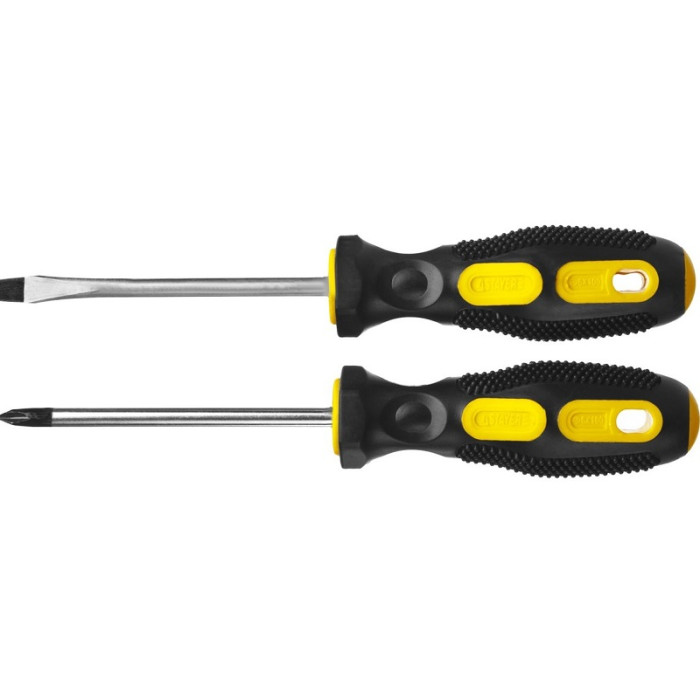 Набор слесарных отверток, 2 / 6мм - 100мм, 2шт STAYER MASTER 2513-H2_z01 используется для работы с резьбовыми соединениями. Стержни отверток изготовлены из хром-ванадиевой стали высокого качества. Наконечники оксидированы и намагничены. Пластиковые двухкомпонентные ручки отличаются маслобензостойкостью. Тип шлица: PH №2 и SL 6.0