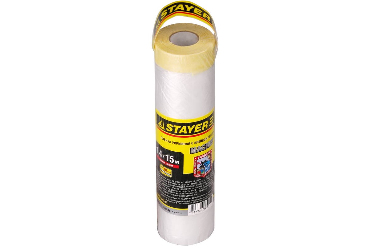 Пленка STAYER обеспечит надежную защиту поверхности от пыли, грязи, влаги и краски при выполнении автопокрасочных и других ремонтных и отделочных работ. Закрепляющая клейкая лента по всей длине полотна позволяет плотно прикрепить пленку к защищаемой поверхности, не оставляя следов после использования. STAYER - качество, проверенное временем.