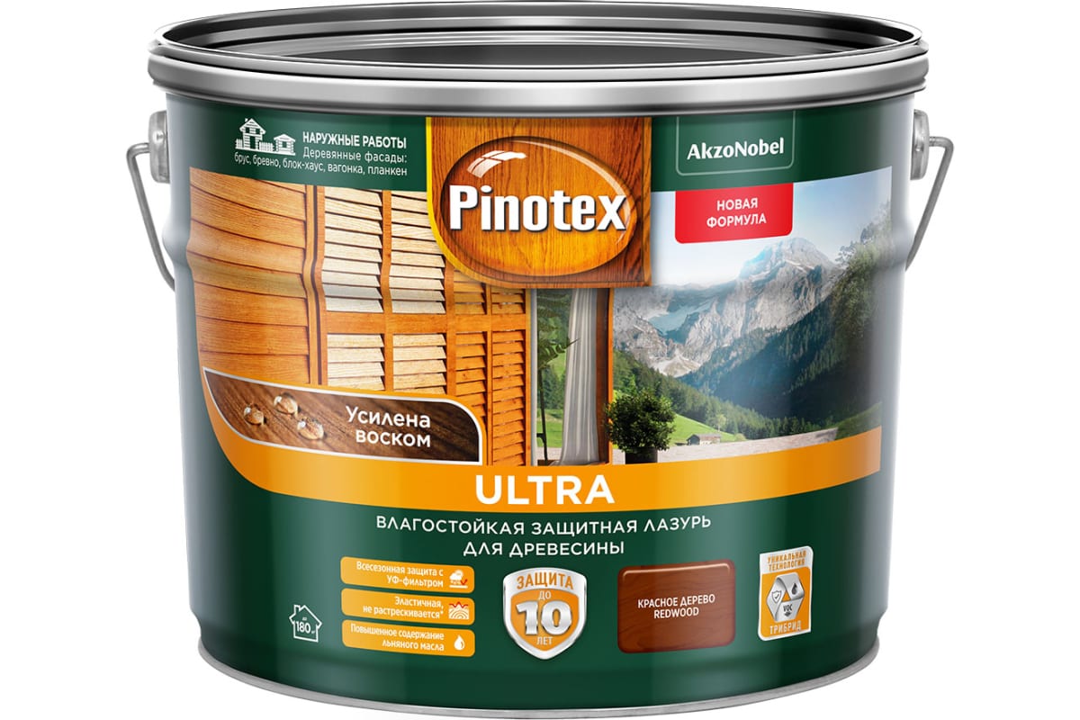 Влагостойкая лазурь на масляной основе для комплексной защиты древесины от атмосферных явлений до 10 лет. Состав усилен воском, обеспечивая повышенные грязе- водоотталкивающие свойства покрытия. Связующее лазури разработано с использованием технологии ТРИБРИД. Высокое содержание алкидных смол нового поколения создает прочное и эластичное защитное покрытие, которое не растрескивается. Льняное масло питает глубокие слои древесины, уменьшая естественное ее старение и разрушение (образование трещин, рассыхание). Часть органического растворителя (уайт-спирита) заменена водой, поэтому лазурь имеет менее выраженный запах, сниженное содержание ЛОС (Летучие Органические Соединения) и легче наносится, в отличие от продуктов на полностью органическом растворителе. Подчеркивает естественную текстуру древесины, полуглянцевая. С УФ-фильтром для дополнительной защиты от солнечных лучей и добавками против плесени и синевы. Рекомендуется применять в системе с грунтовкой Pinotex Base для усиления защитных свойств.