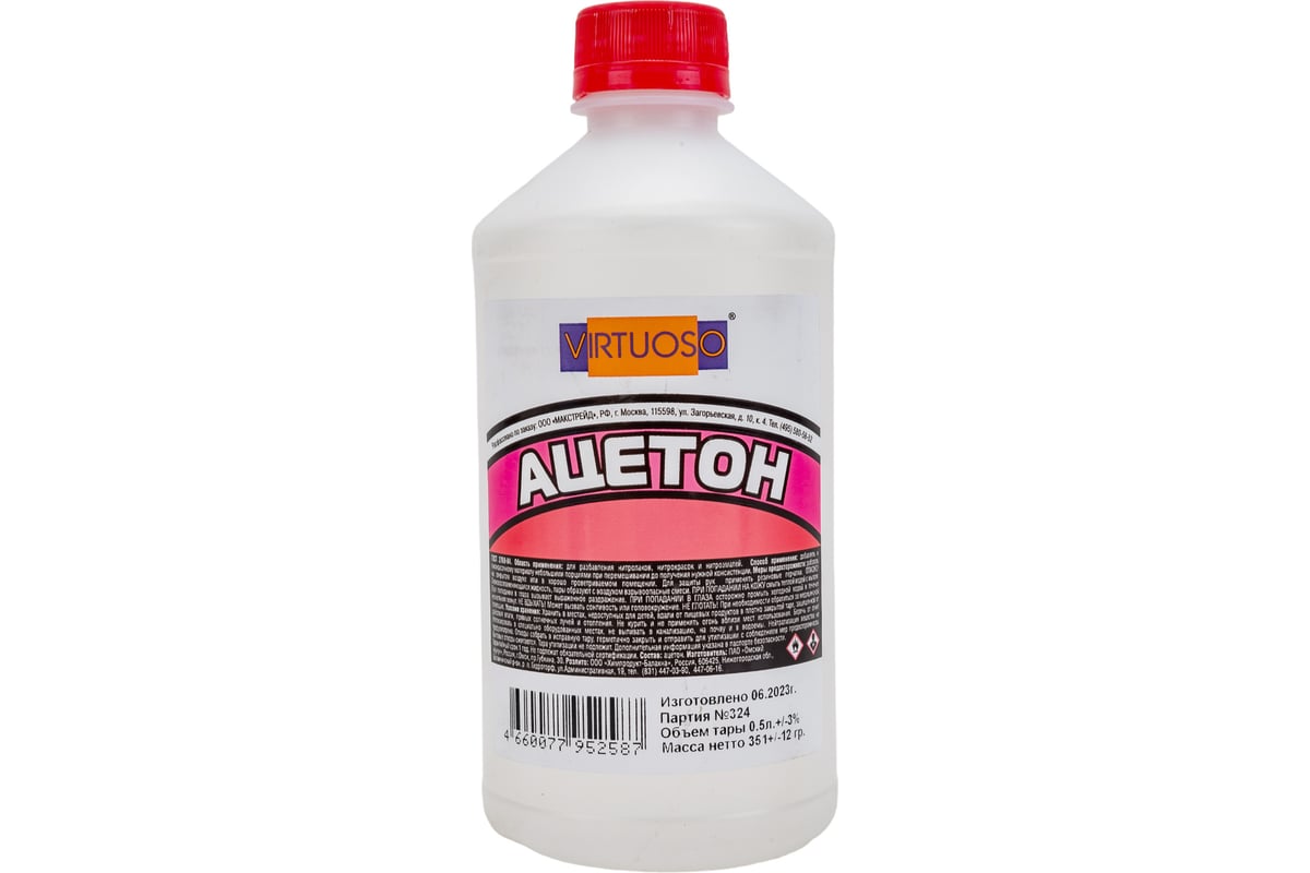 Ацетон VIRTUOSO 0.5 л 11602036 может обезжиривать поверхность, разбавлять или улучшать качество лакокрасочных материалов при добавлении его в состав.