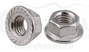 Гайка шестигранная с фланцем. Описание: Материал: сталь С1035. Покрытие: белый цинк. DIN 6923. Применение: Применяется в крепежных соединениях в комплекте с болтом, шпилькой, винтом и т.д. Внутренняя сторона фланца имеет насечки, препятствующие самопроизвольному выкручиванию. Может применяться в системах подверженных вибрационным нагрузкам. Используется в машиностроении, строительстве, приборостроении.