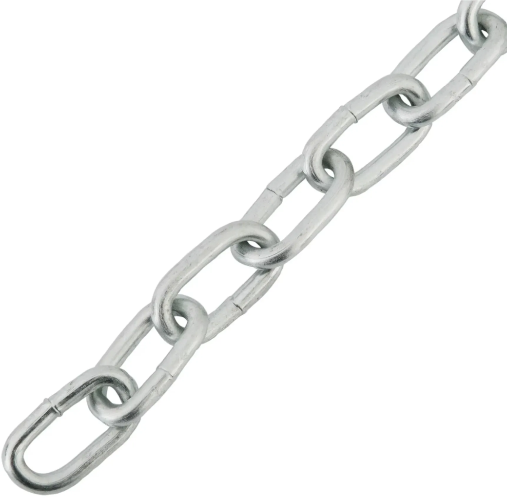 Оцинкованная короткозвенная цепь 8 мм с овальной формой звена изготовлена из стали сварным способом. Используется в качестве растяжек, для создания подвесов, закрепления тяжелых грузов при транспортировке.