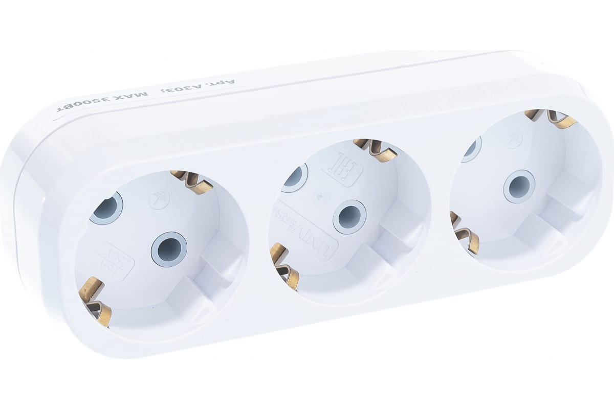 Плоский разветвитель 3 гнезда, заземление, белый 16А 250В UNIVersal А303 используется для подключения к электросети сразу трех электрических приборов. Корпус изготовлен из прочного и надежного пластика. Тройник оснащен заземлением для повышения уровня безопасности при эксплуатации бытовых приборов.